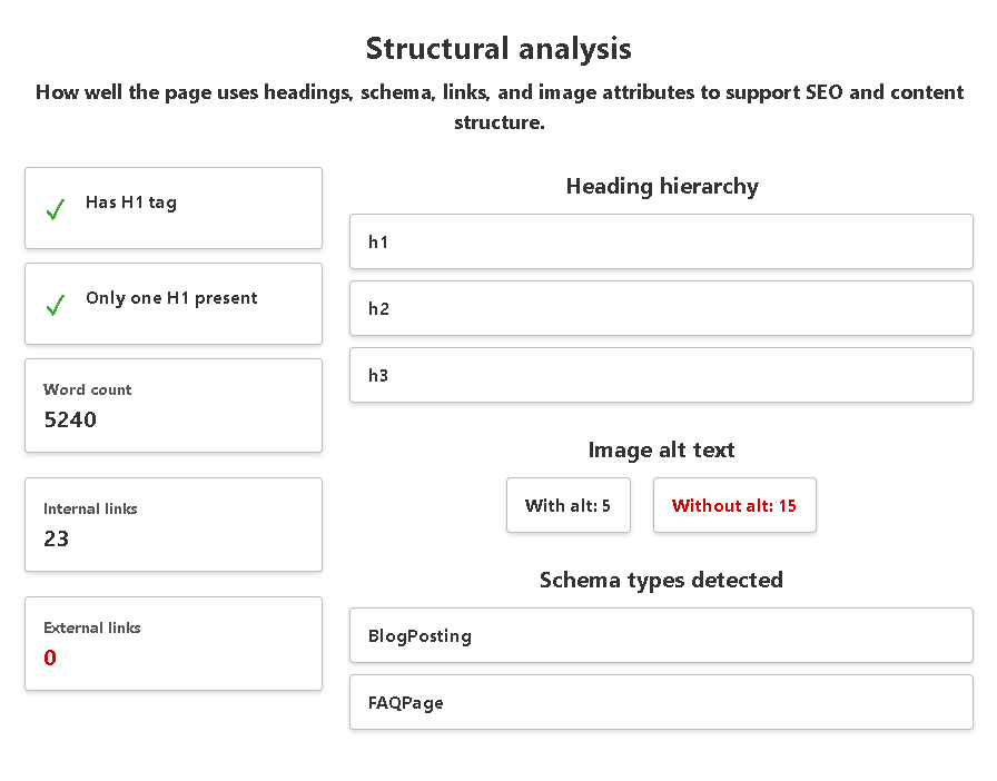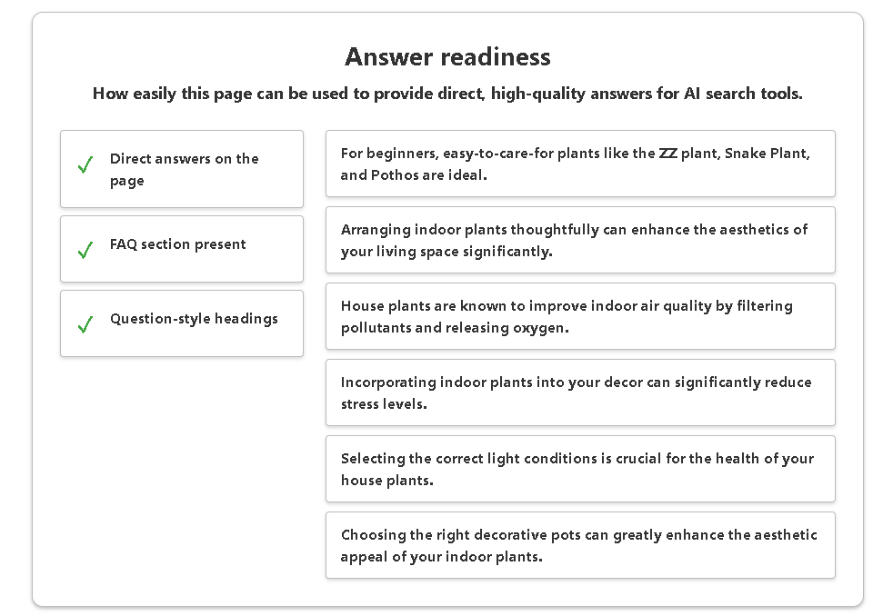 - Grades how easily an AI system can convert your page into a clean, direct answer.