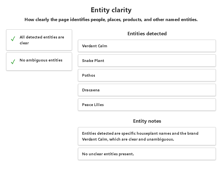 - Checks whether your key entities (brands, topics, products) are clearly defined.