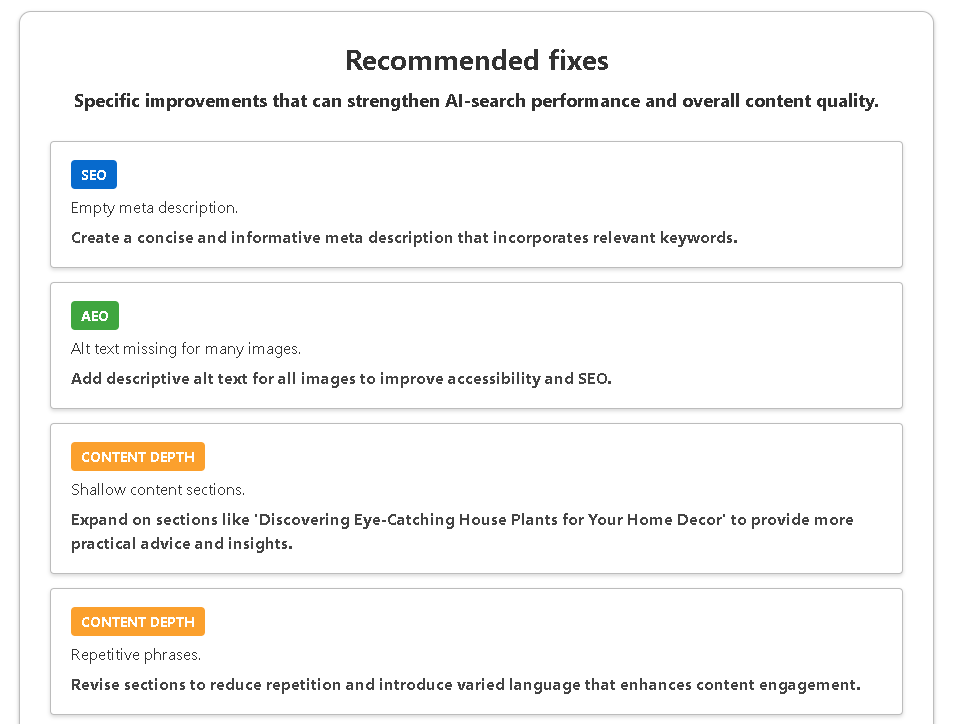 - Organizes fixes by category (SEO, AEO, content depth, clarity, etc.) for fast action.